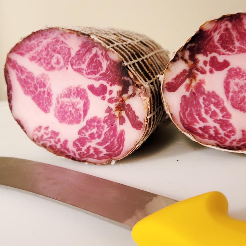 Air-dried and cured with a traditional method. It is delicate, tender, fatty, and has a buttery flavor.